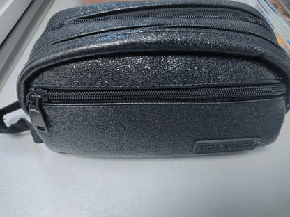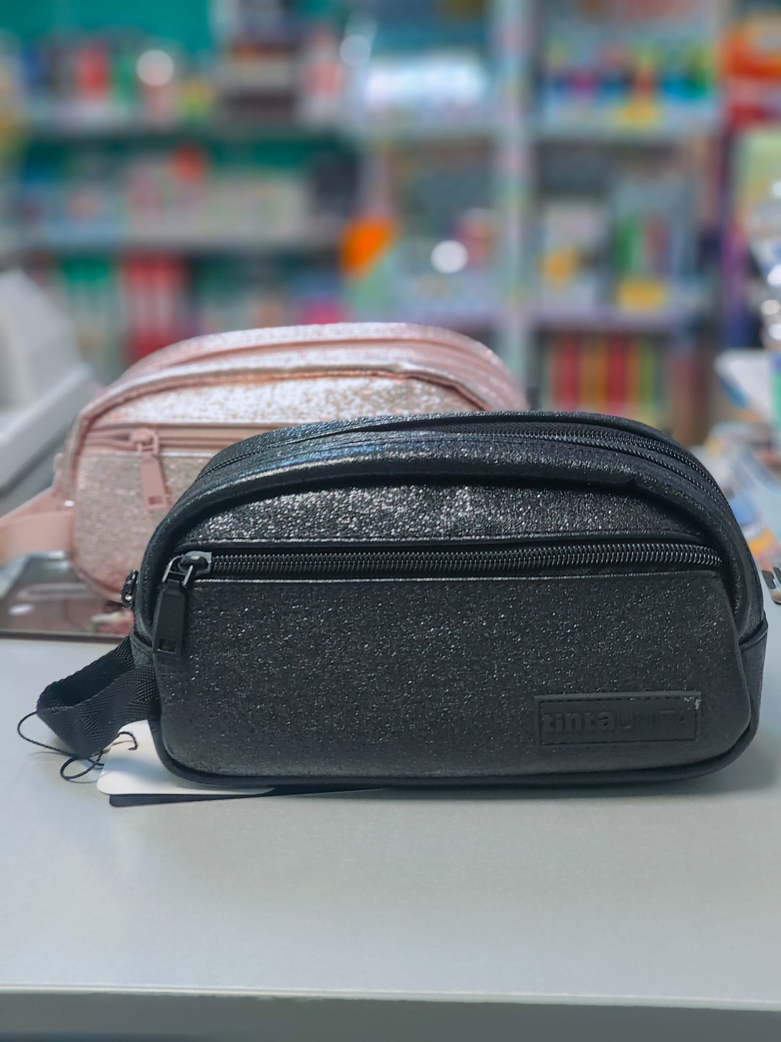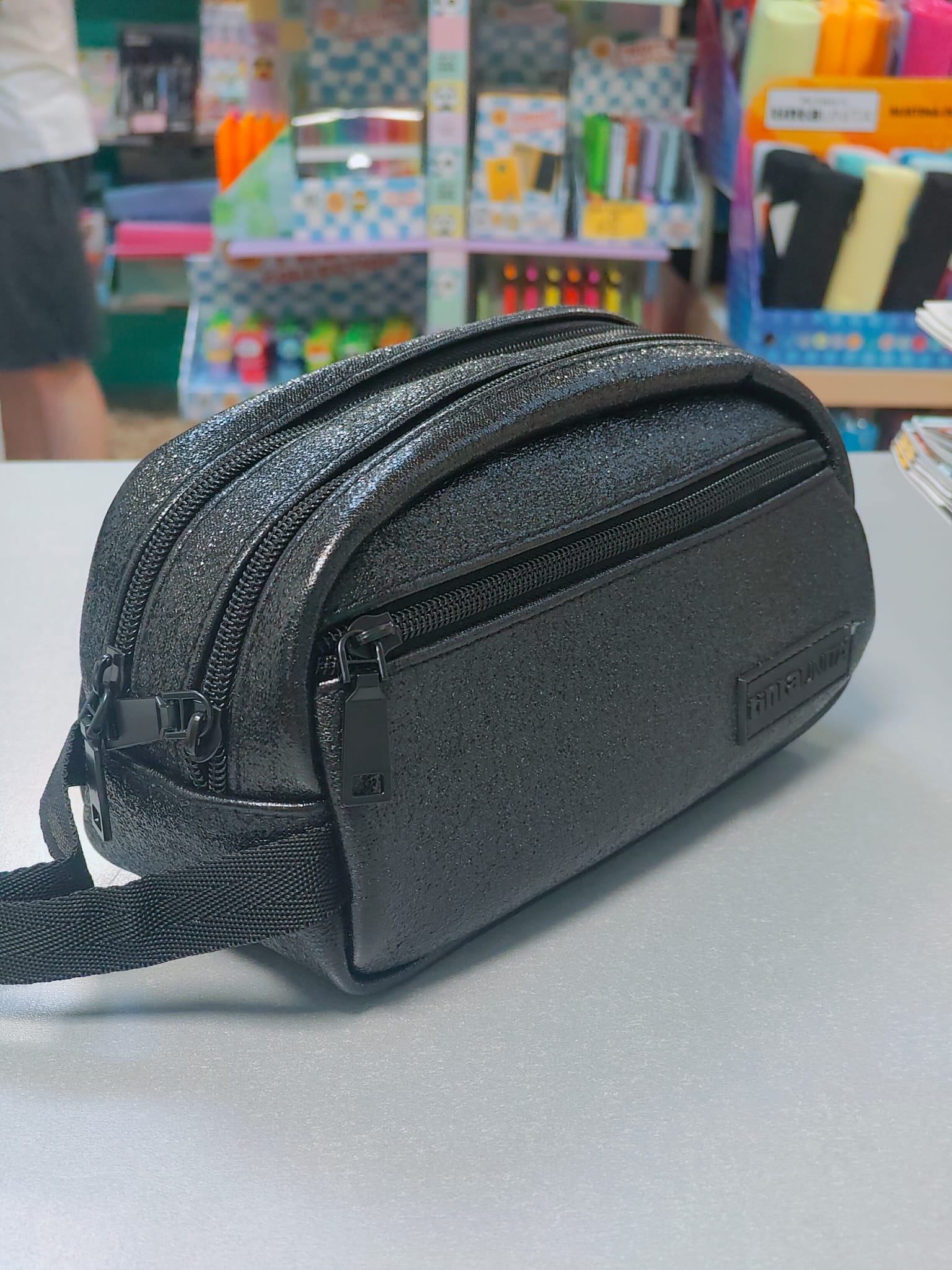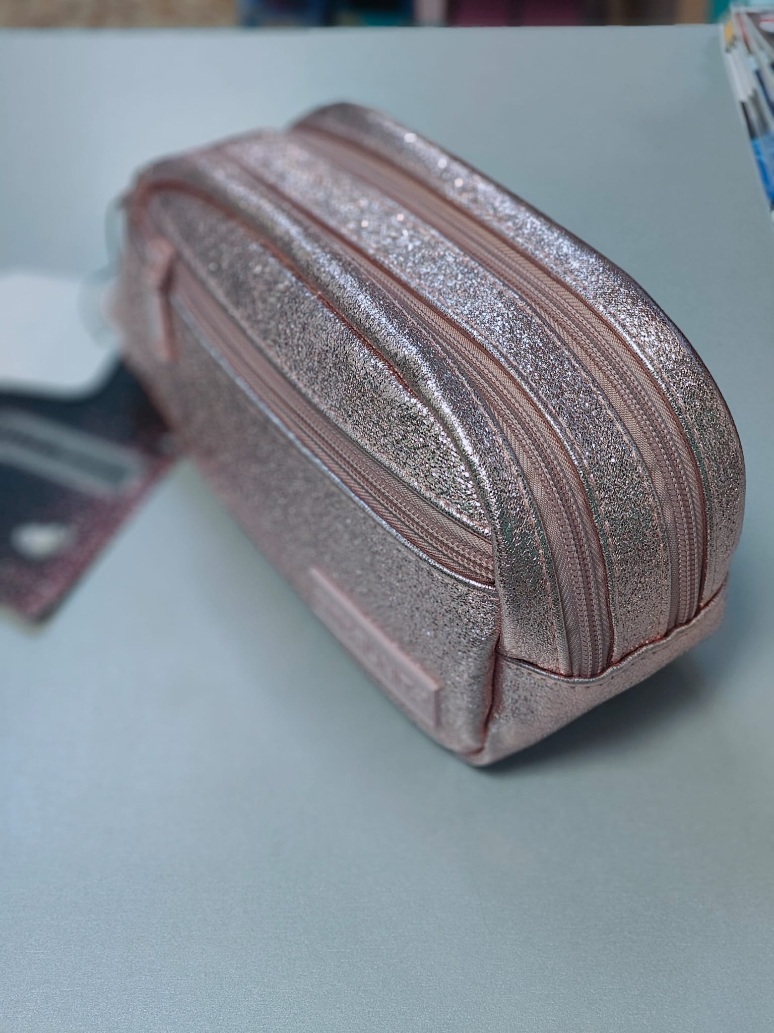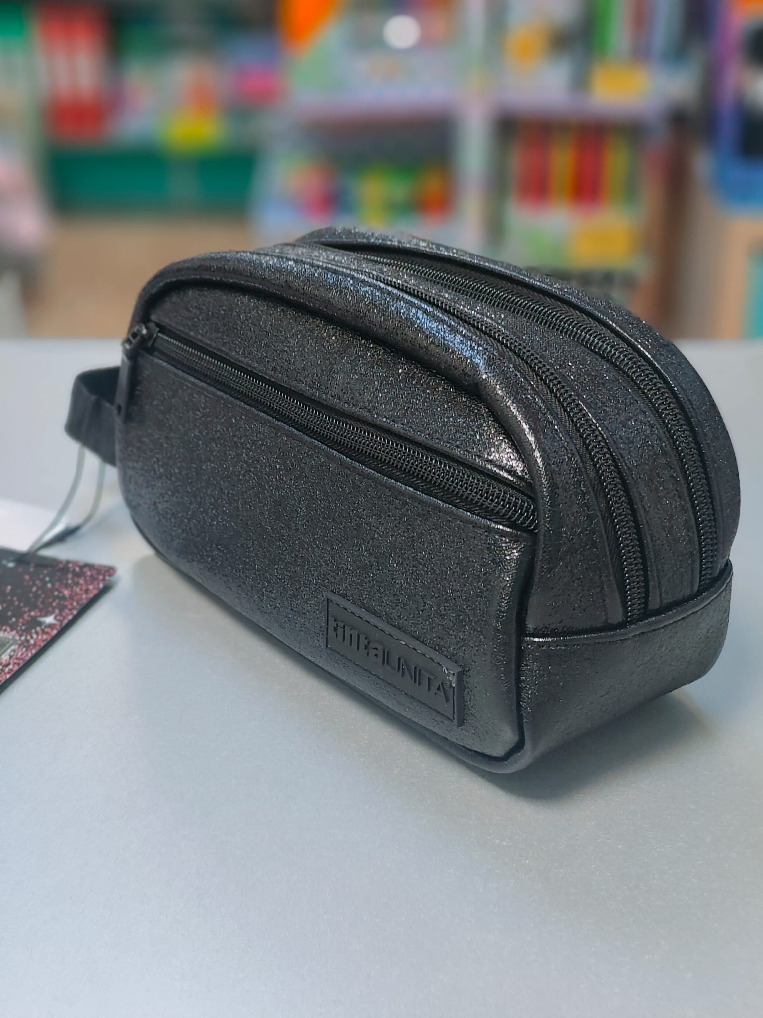 due ampie tasche con doppia zip che permette di poter suddividere la cancelleria o lo puoi utilizzare come pochette quindi anche make up in modo ordinato, pratico e molto spazioso. inoltre ha una maniglia esterna in tessuto per il trasporto ed una tasca esterna con zip per i piccoli oggetti
