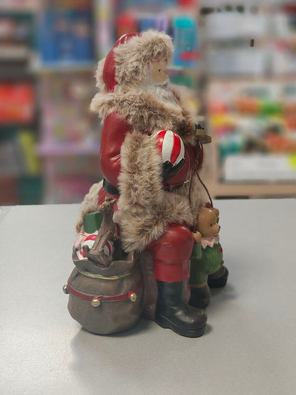 Babbo natale seduto su uno sgabello con in mano giocattoli e accanto un sacco con all'interno giocattoli.