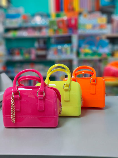 Scopri queste stilose Borsette Bowling Bag dai colori fluo con catenella color oro e pratiche maniglie in pvc. chiusura a zip.