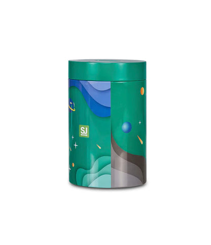 Salvadanaio in latta, leggero e resistente, per iniziare i più piccoli al risparmio. Rimuovendo il coperchio superiore può essere utilizzato anche come portamatite.