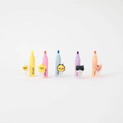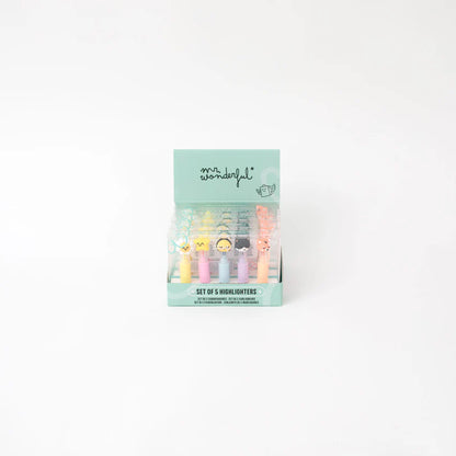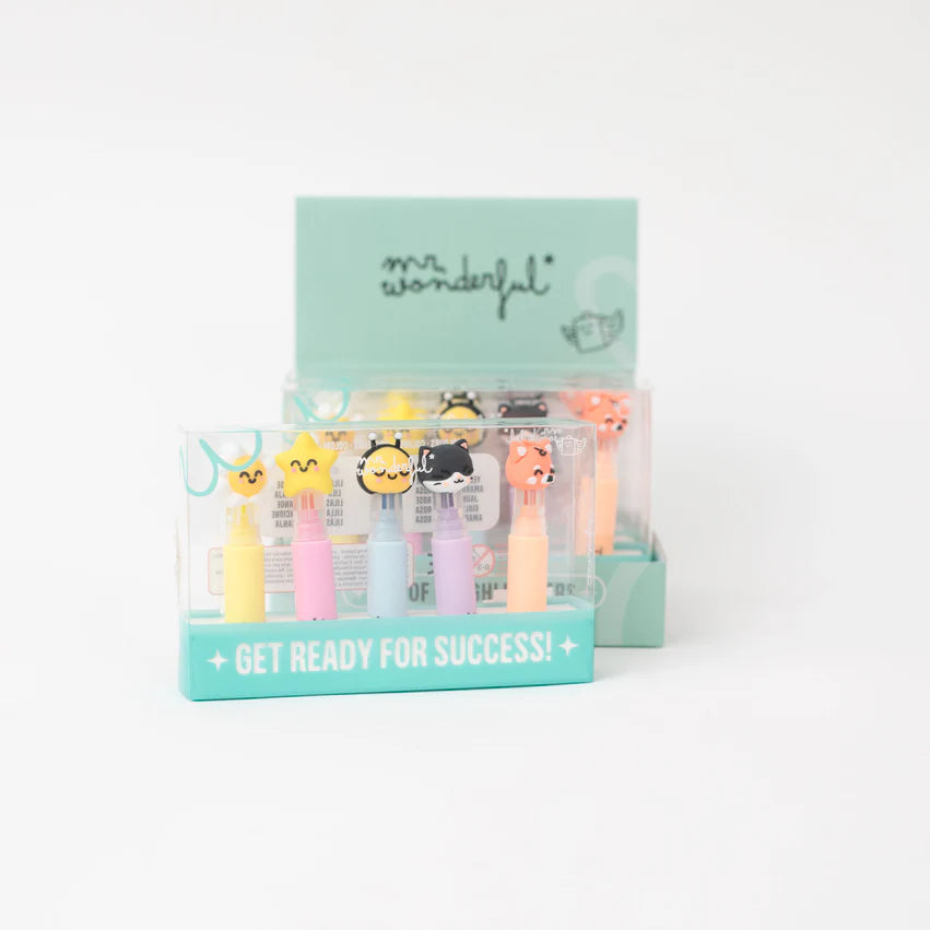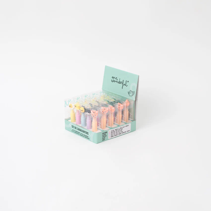 Set di 5 evidenziatori dai toni pastello, ognuno con un cappuccio a forma di uno dei nostri personaggi di Mr. Wonderful. Presentati in un grazioso astuccio trasparente.