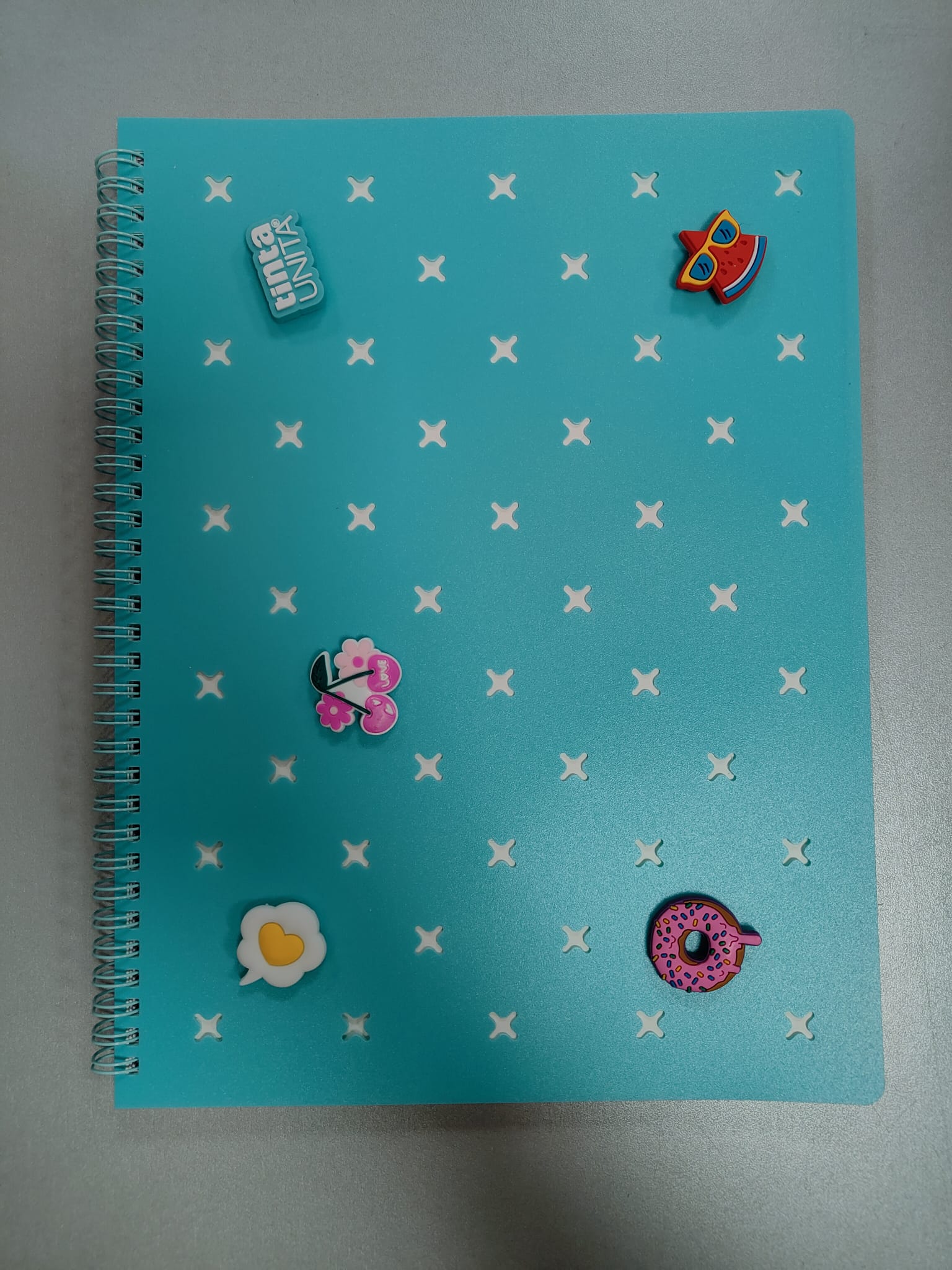 Quaderno dai colori vivaci doppia copertina, quella esterna in silicone e personalizzabile con le pins (5 già inclusi) e quella interna in cartoncino.